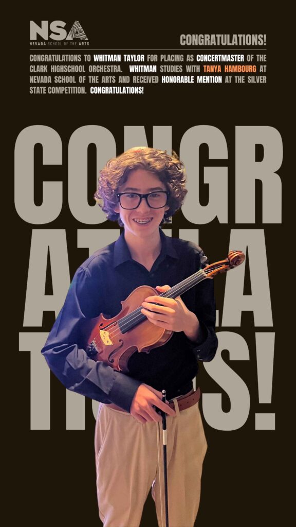 A huge shoutout to Whitman Taylor for earning the Concertmaster position in the Clark High School Orchestra! Β Whitman takes violin lessons with Tanya Hambourg at Nevada School of the Arts (NSA) and recently received Honorable Mention at the 2024 Silver State Competition. Bravo, Whitman! π